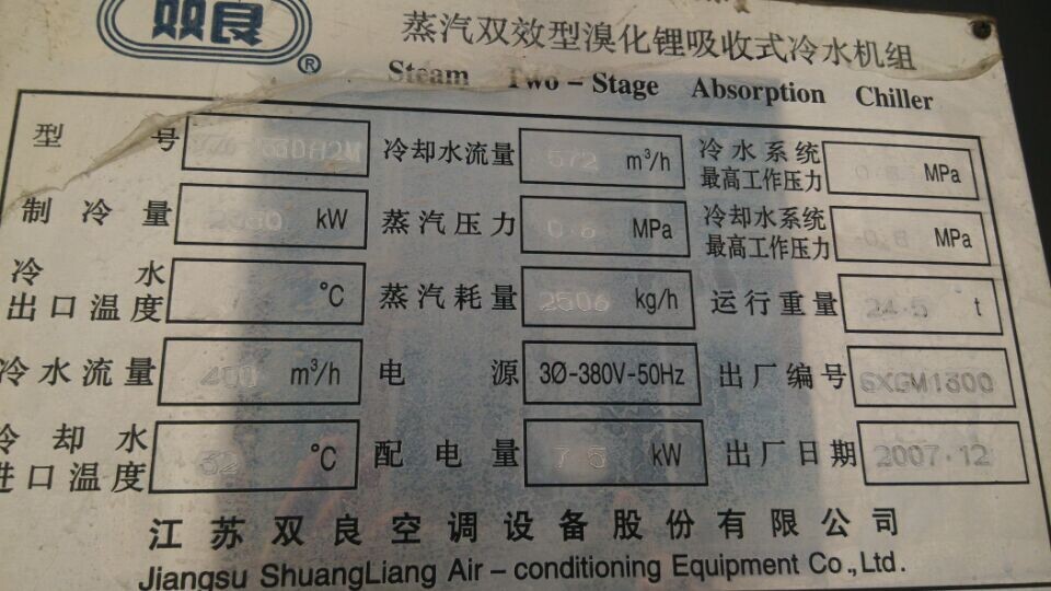 處理200萬大卡江蘇雙良溴化鋰制冷機;詳細參數(shù)SXZ6-233DHM2,生產(chǎn)日期2007年12月,制冷量2330KW,200萬大卡,機組在位運行,運行狀況良好,外觀成色8成新,可質(zhì)保1年,有需要者請與王志高聯(lián)系;手機13861712925,13812296168(手機號碼可添加微信)有圖有真相: